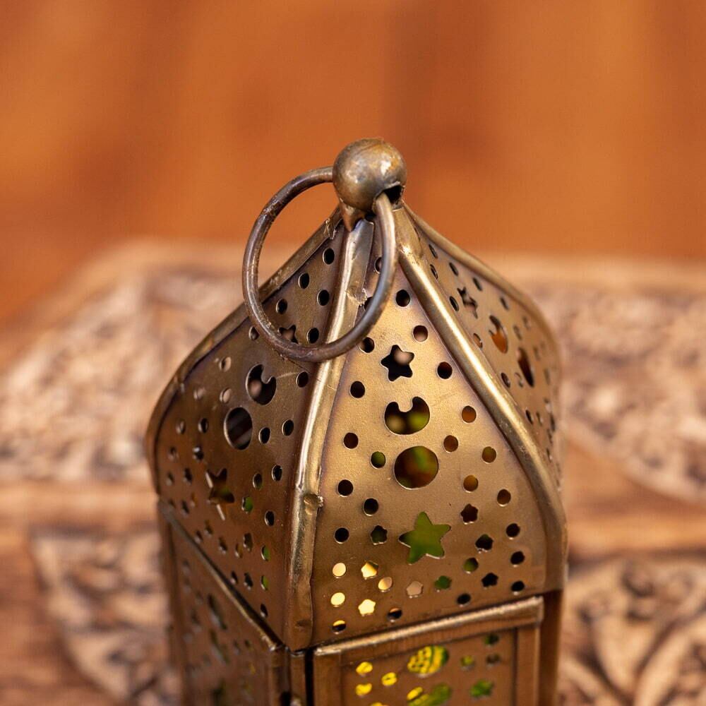 装飾の入った色とりどりのガラスが周りに付いていて、ガラス越しに見えるキャンドルライトの明かりはとても綺麗。上部に開いている穴からも明かりがこぼれ、壁に投影される影を見ていると癒やされます。使っていない普段もガラスが綺麗でインテリアとして映えて素敵です。