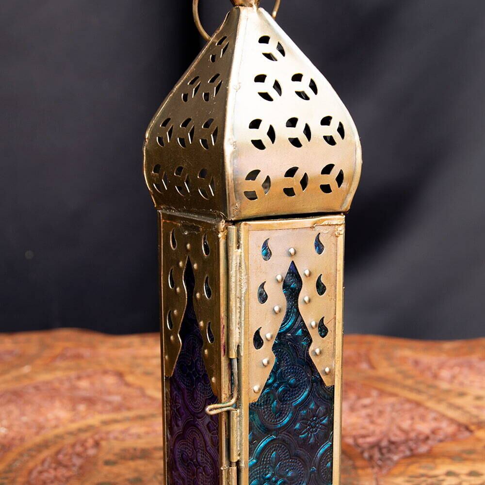 装飾の入った色とりどりのガラスが周りに付いていて、ガラス越しに見えるキャンドルライトの明かりはとても綺麗。上部に開いている穴からも明かりがこぼれ、壁に投影される影を見ていると癒やされます。使っていない普段もガラスが綺麗でインテリアとして映えて素敵です。
