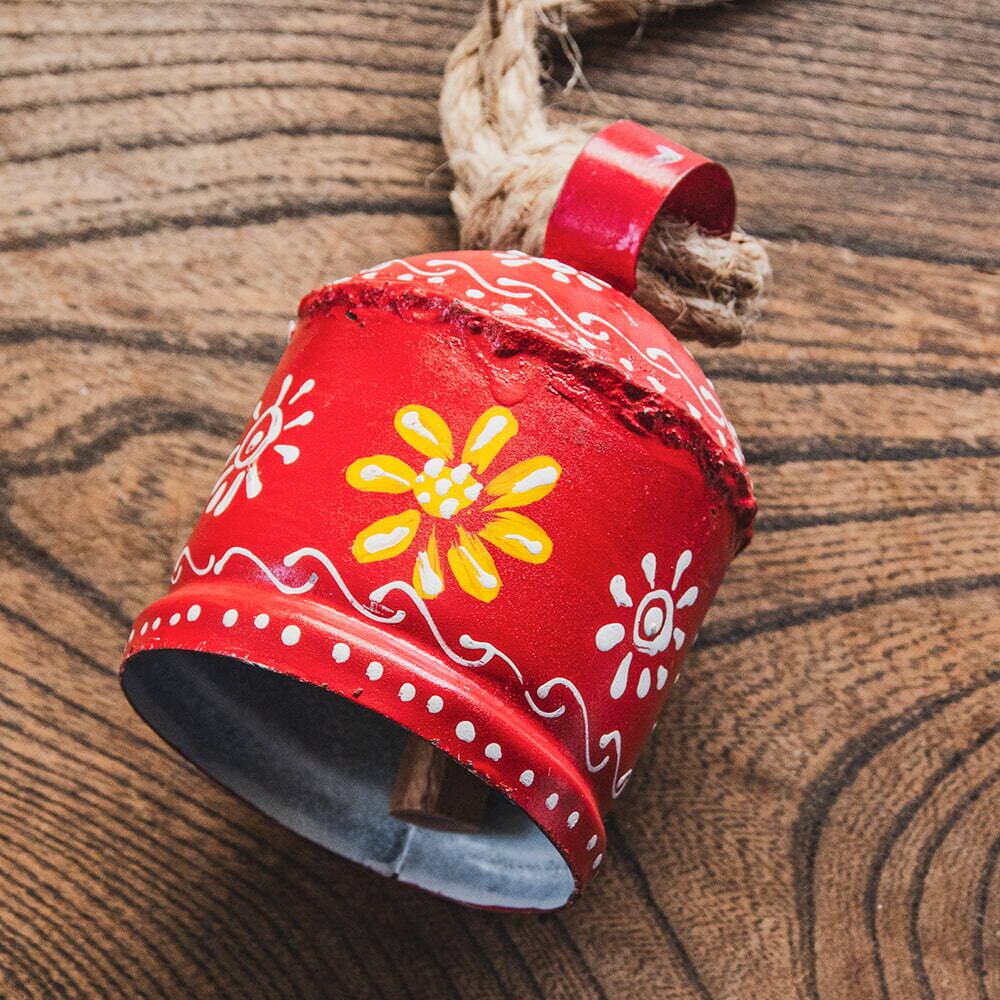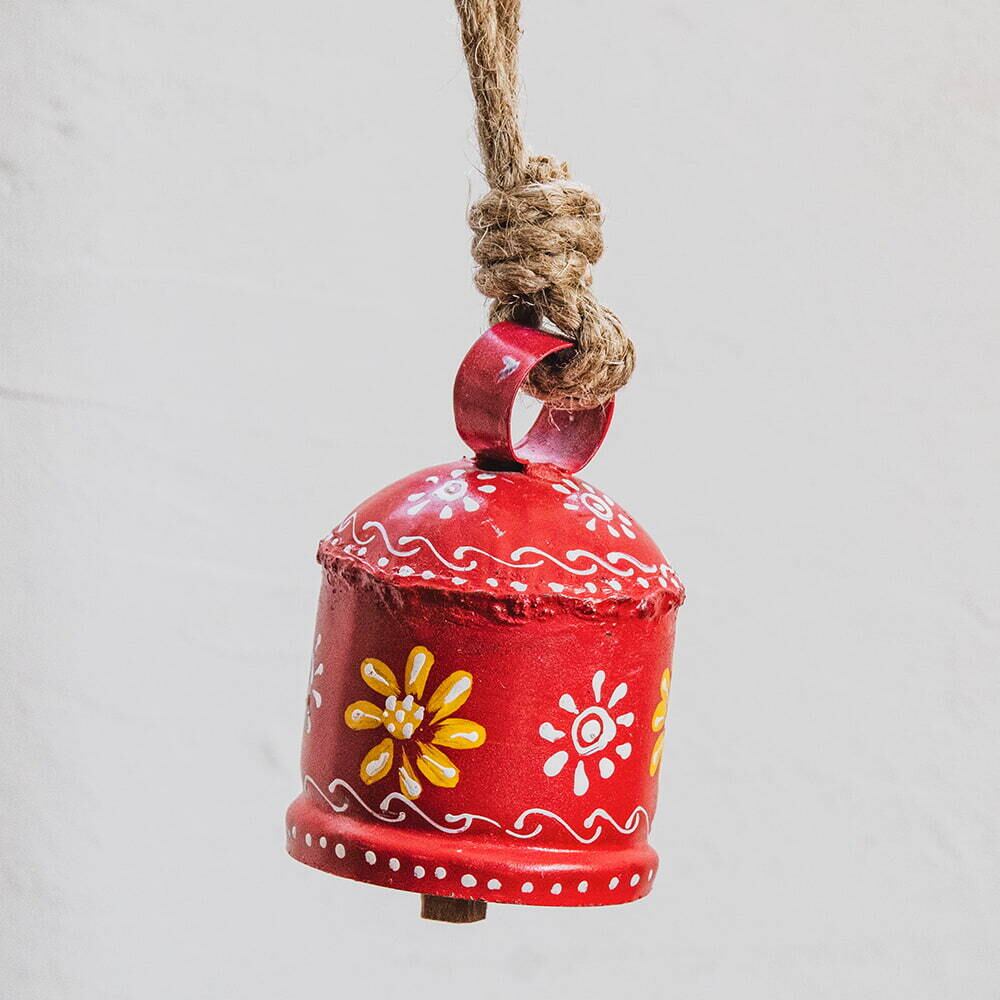 ジュート紐とハンドペイントの手作りベル インドの素朴な味わい 鐘形 赤