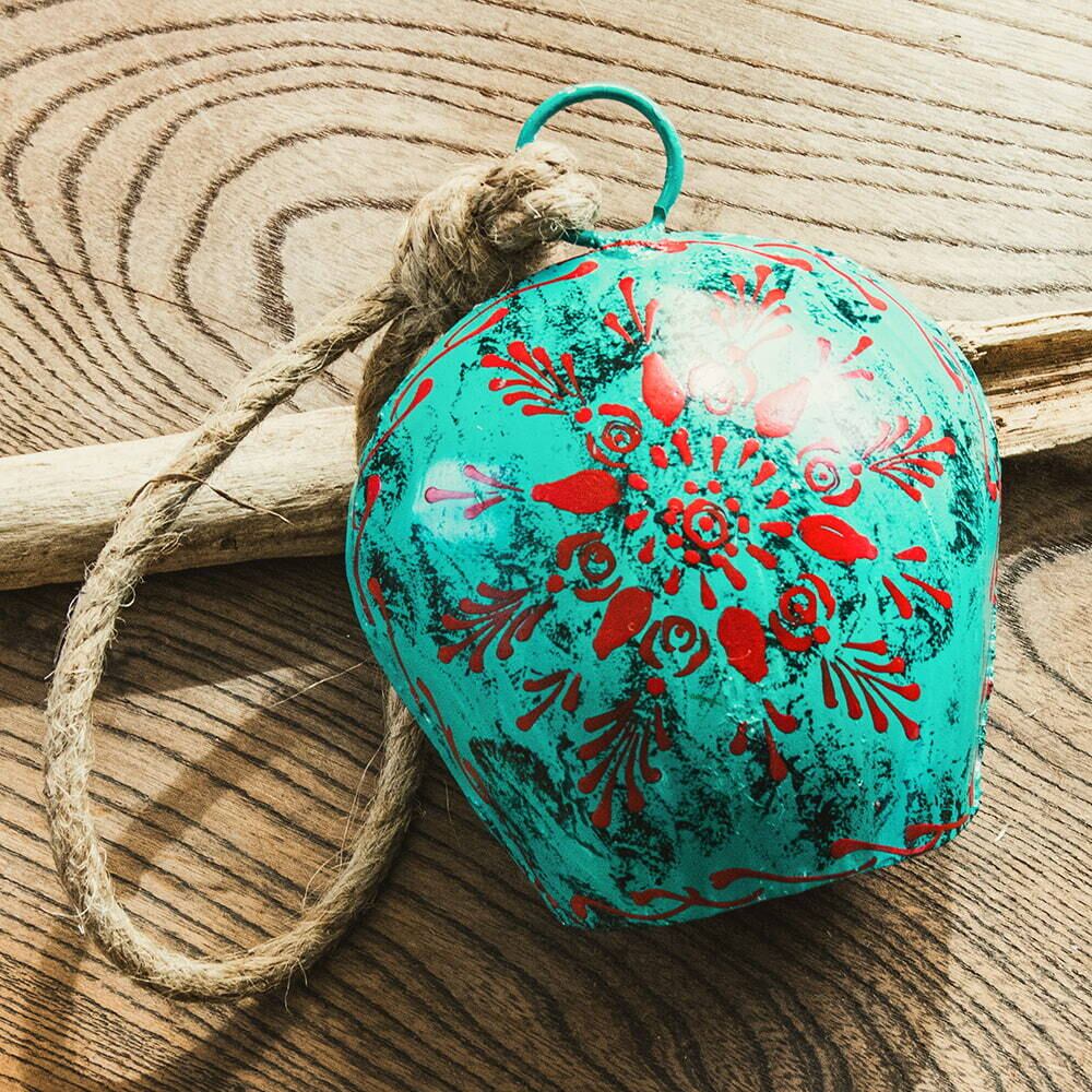 ジュート紐とハンドペイントの手作りベル インドの素朴な味わい ふくら形 ターコイズ